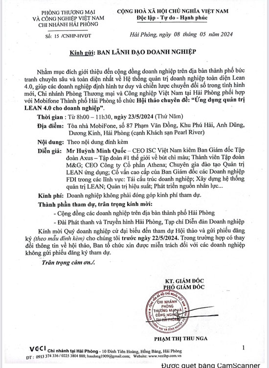 Phòng Thương Mại Công Nghiệp Việt Nam- Chi Nhánh Hải Phòng (VCCI) gửi công văn số 15/CNHP đến Lãnh đạo các Doanh Nghiệp Hội viên Hiệp hội Doanh nghiệp nhỏ và vừa tỉnh Hải Dương tham dự Hội thảo: Ứng dụng quản trị Lean 4.0.